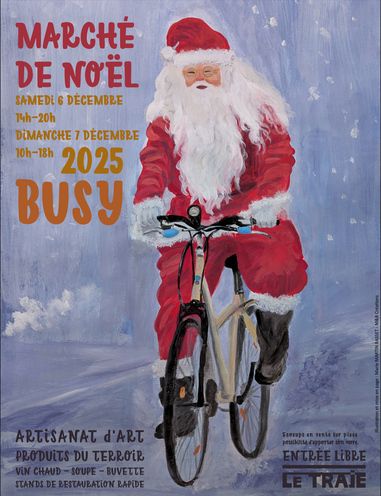 Venez vivre la magie de Noël à Busy où l'association le Traje organise un magnifique marché dans une ancienne ferme au cœur du village. Ce sera l'occasion de découvrir des produits artisanaux et gastronomiques dans une ambiance chaleureuse et conviviale... Ce sera aussi l'occasion de faire de petits cadeaux de Noël solidaires : artisanat ukrainien, casquettes brodées, articles confectionnées par des réfugiées ukrainiennes...