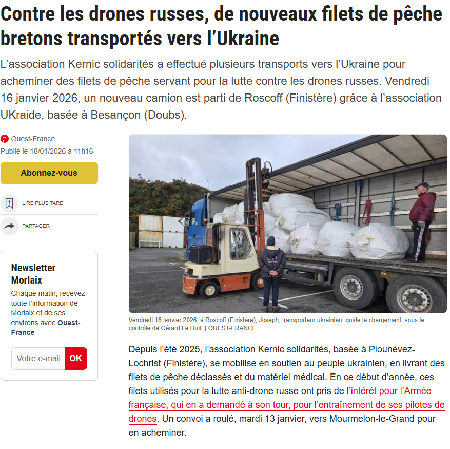 Article de Ouest France : Contre les drones russes, de nouveaux filets de pêche bretons transportés vers l'Ukraine
