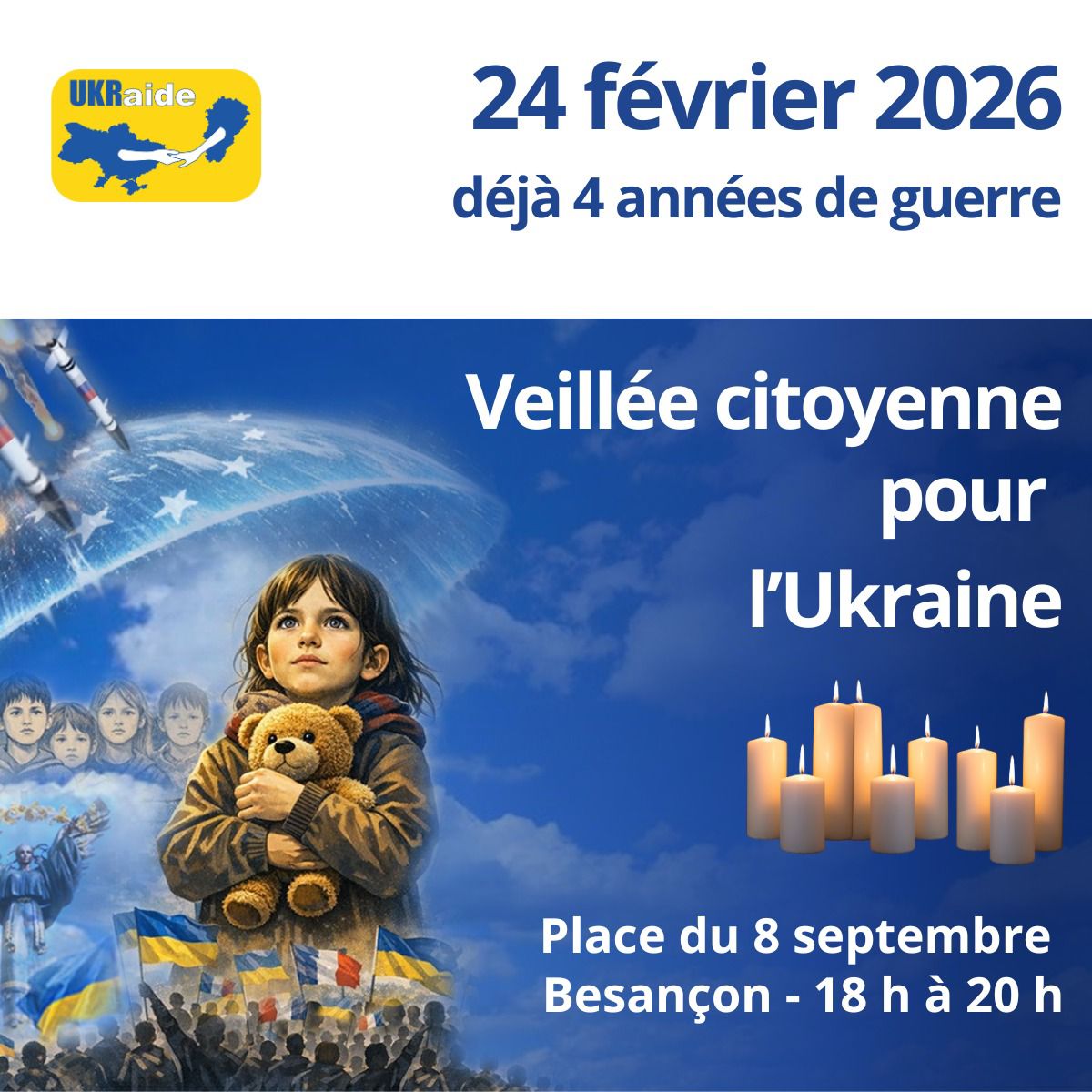 Nous vous donnons rendez-vous mardi 24 février, place du 8 Septembre à Besançon, de 18 h à 20 h pour témoigner ensemble de notre soutien à l'Ukraine.