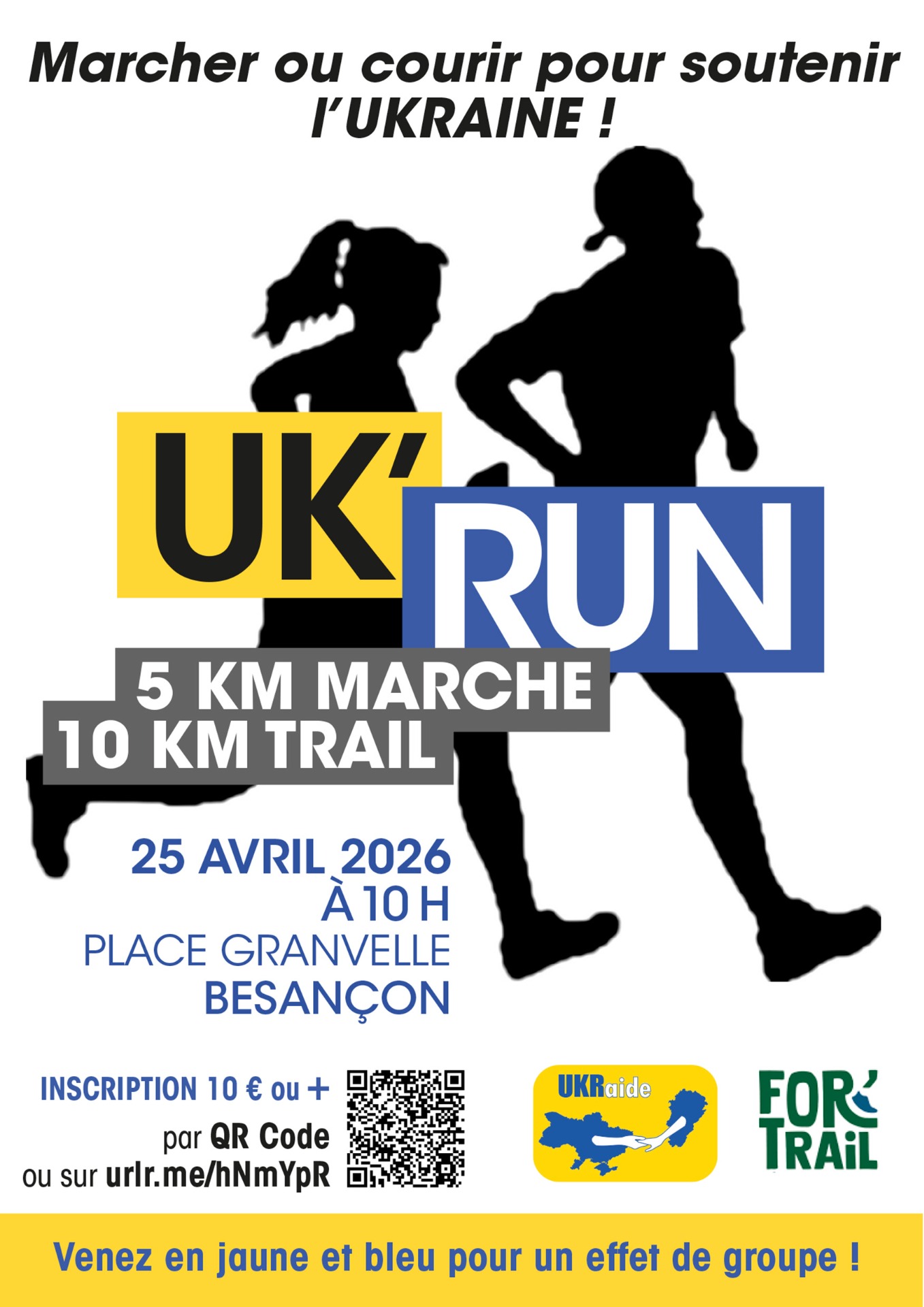 Rendez-vous le 25 avril à 10 h en ville pour un trail de 10 km ou une marche de 5 km. Et comme bien sûr c'est en soutien à l'Ukraine, dress code bleu et jaune si vous pouvez.